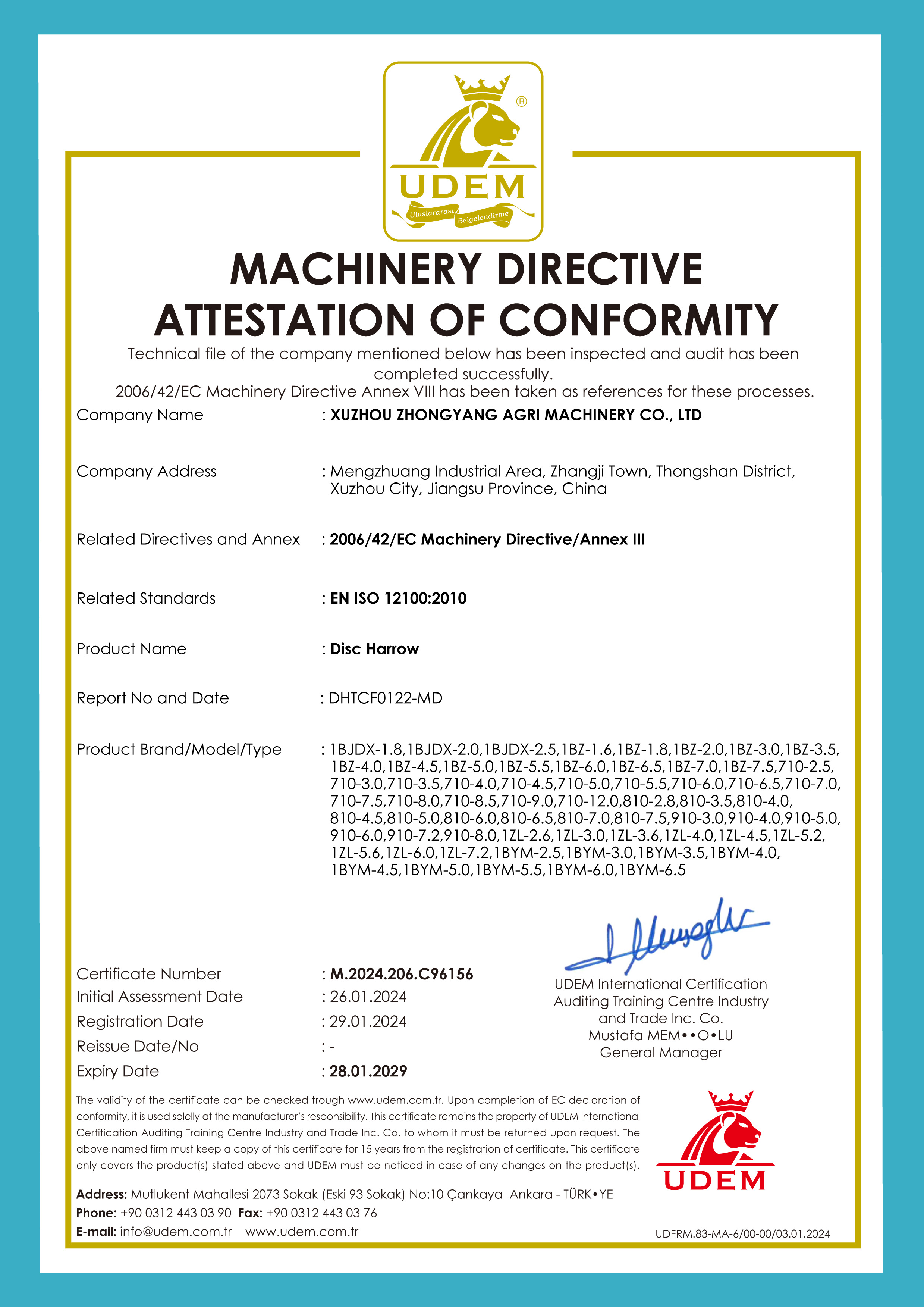 1ZL-5.2 Once-Cover Tillage Machine Working Width : 5.2m , Working Depth : 12cm , Discs No : 56pcs, Disc diameter : 510mm, Overall weight : 4000kg, matched power is 180-200hp Combined Land Preparation Diac Machine can complete the pulverizer,...